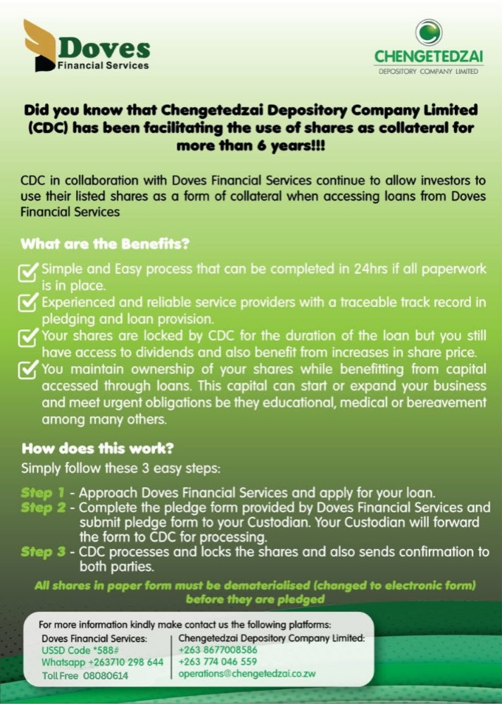 Doves Financial Services Managing Director Shepard Chihoro said the collaboration aims to provide liquidity to shareholders without requiring them to sell off their investment portfolios. By leveraging CDC’s central securities depository infrastructure, the two entities have streamlined a process that has been facilitating the use of shares as collateral for over six years.