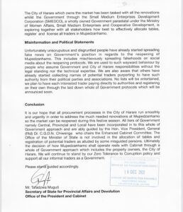 “We are also aware that others have already started collecting names of potential traders purporting to have such authority from their political parties and associations. No lists will be entertained, we plan to have each interested trader paying directly to authorities and registering on their own through the laid down whole of government protocols which will be announced soon,” he added.